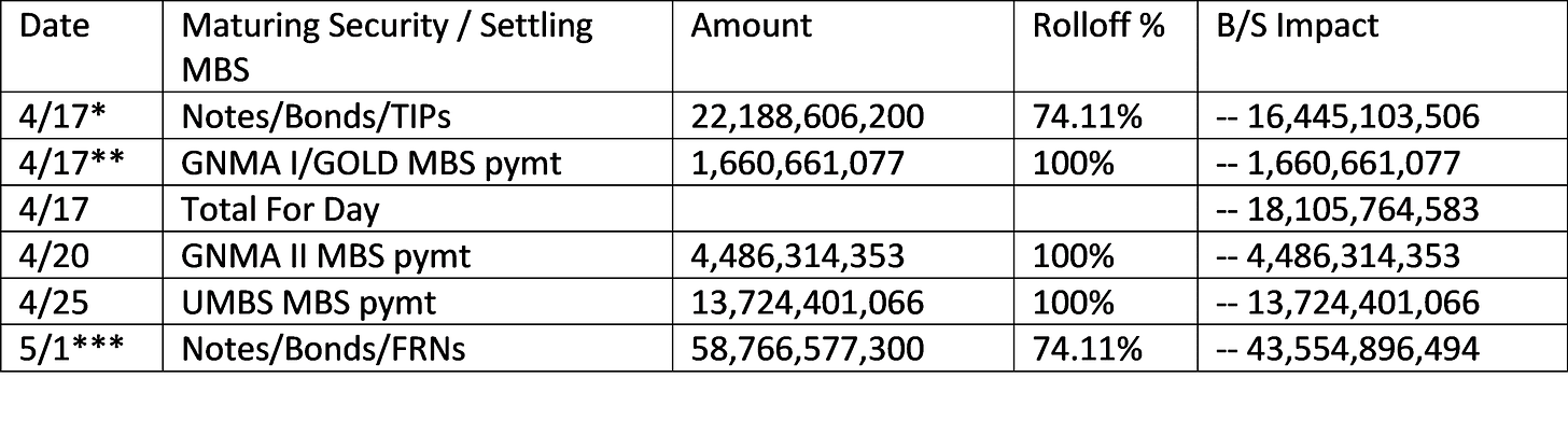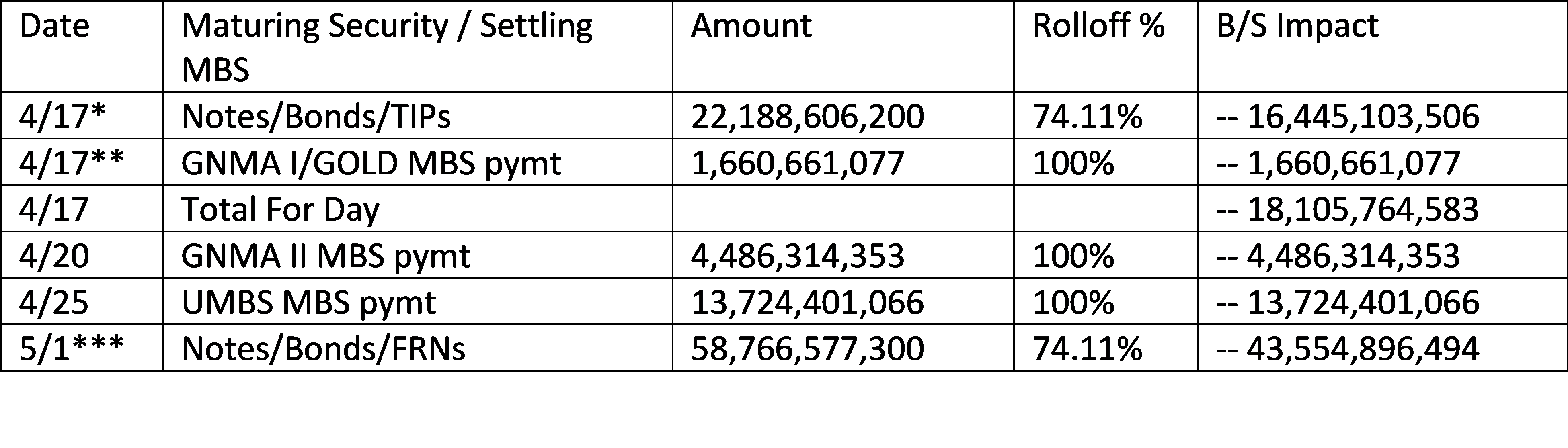 Between the mid month and end month maturities, the Fed rolls off an amount proportional to the total amount maturing. Accordingly, since 60b will be rolled off out of a total ~80.96b for the month. ~74.11% (60/80.96) of the amounts maturing on 4/15 and 4/30 will roll off.