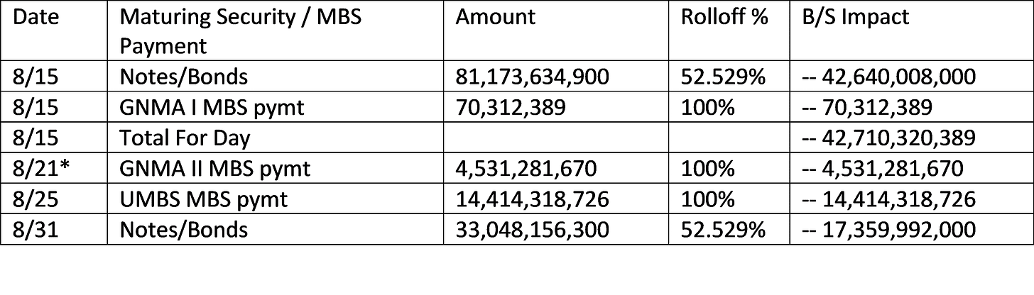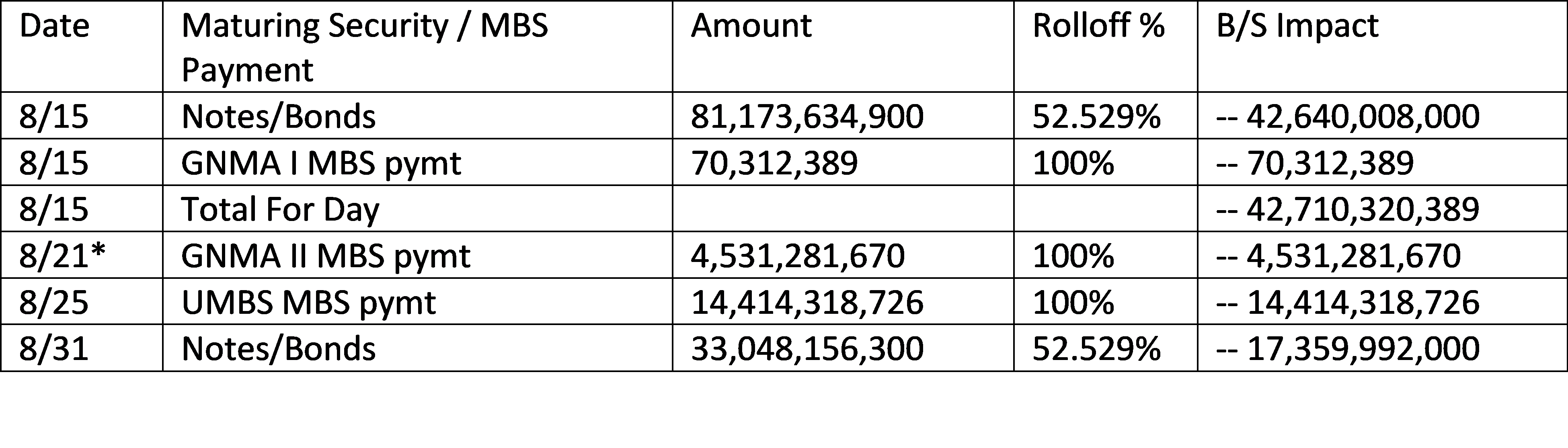 Between the mid month and end month maturities, the Fed rolls off an amount proportional to the total amount maturing. Accordingly, since 60b will be rolled off out of a total ~114.22b for the month. ~52.529% (60/114.22) of the amounts maturing on 8/15 and 8/31 will roll off.