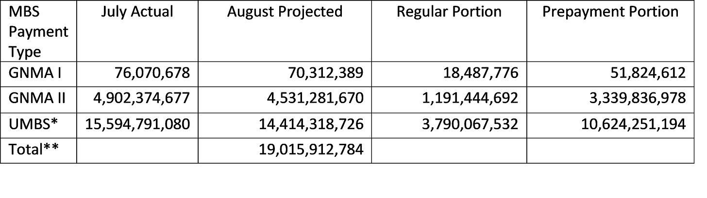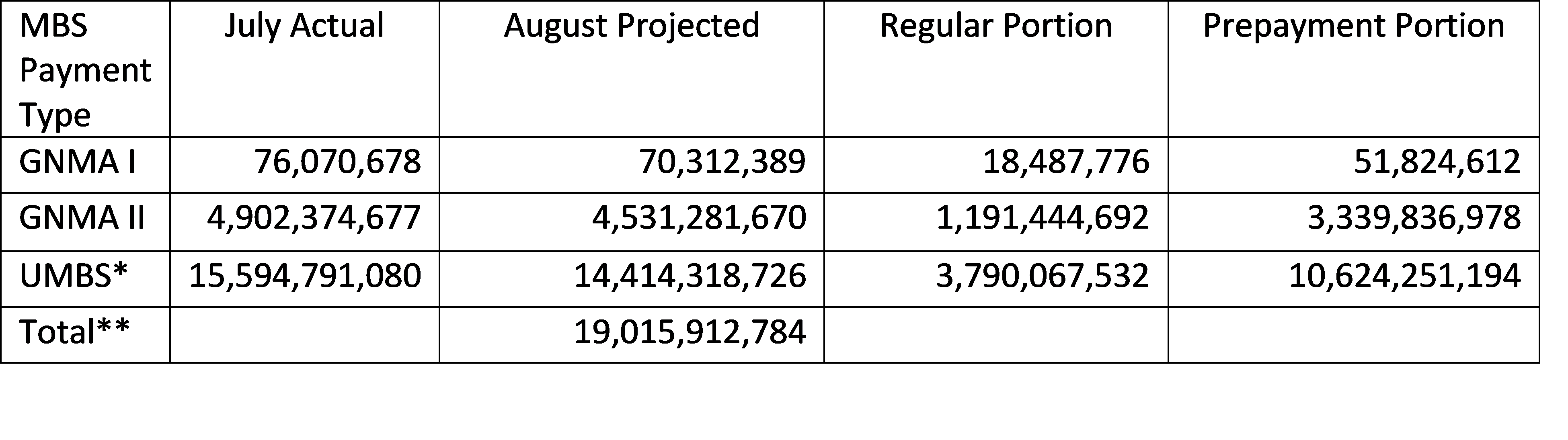 *The GNMA II MBS payment scheduled to be received on Sunday August 20th will instead be received the next business day which is Monday August 21st.