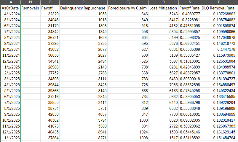 Delinquency Repurchase pool removals fell a touch but remain very high. I expect these will remain high and actually grow some if prevailing rates dont rise again.