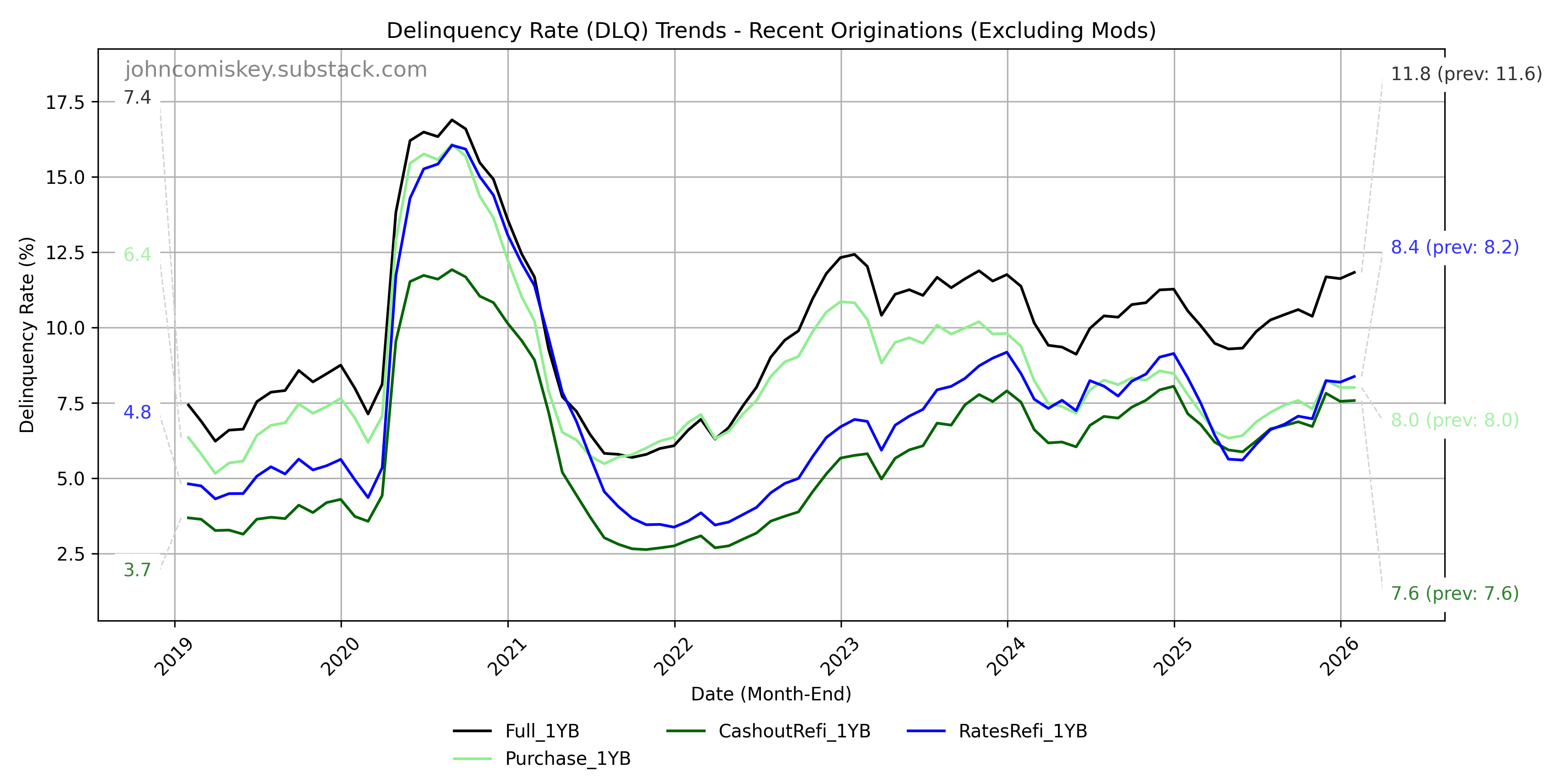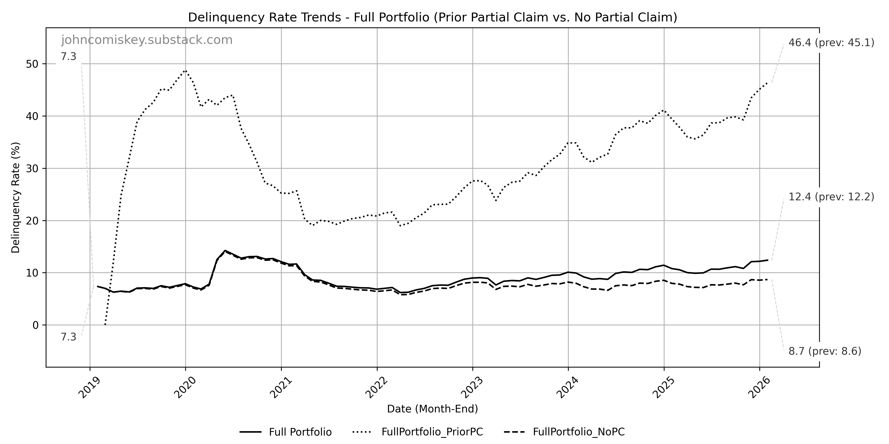 January represents one last month of this mechanical effect. Loss mitigation workouts like partial claims and loan modifications entered into since the new rules took effect on Oct. 1 literally cannot have completed their trial payment plans and thus reflected in the data as current and lower the numerator in the delinquency rate calculations. So January will likely be the high water mark as some of these plans start to complete next month.