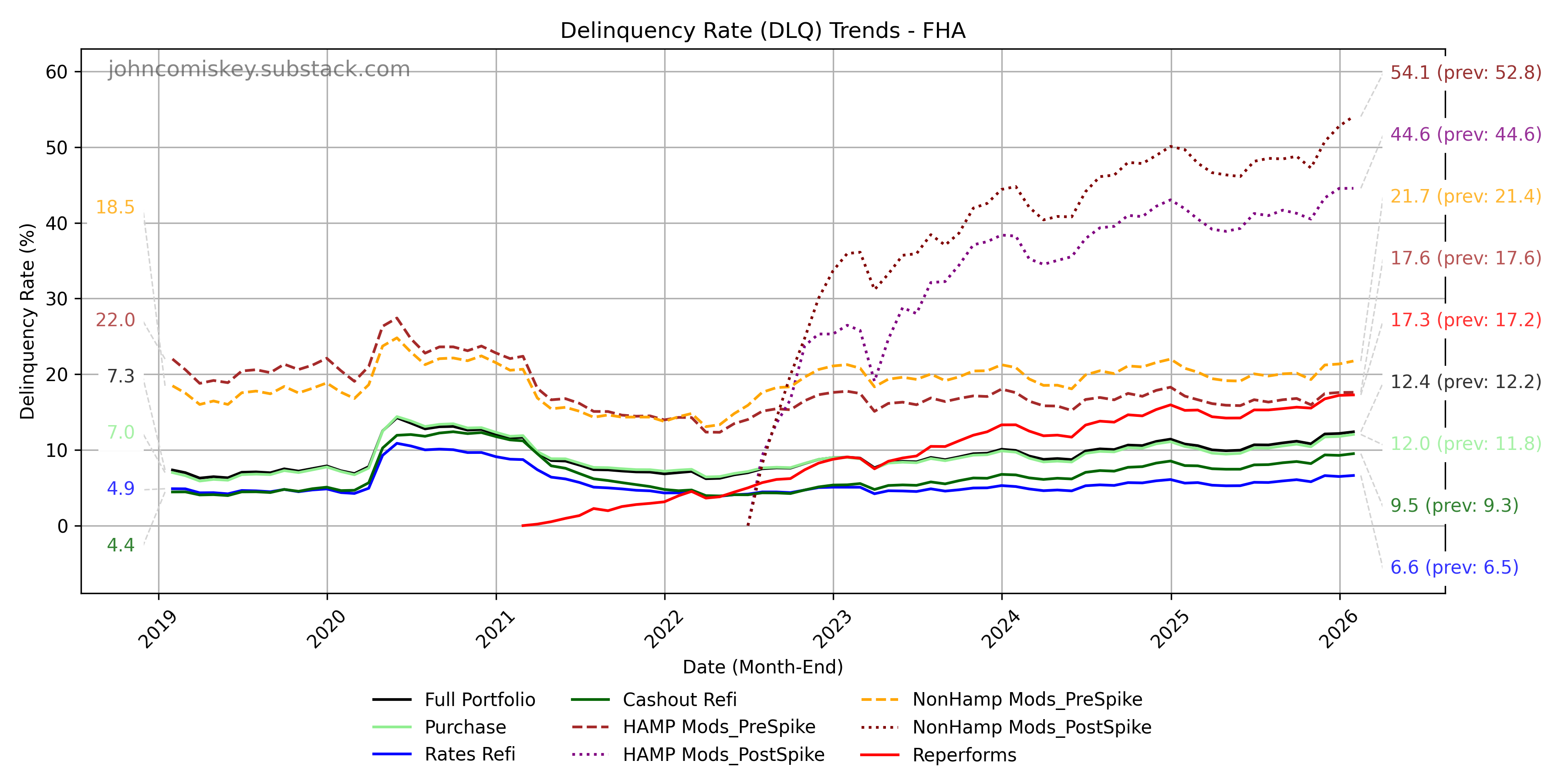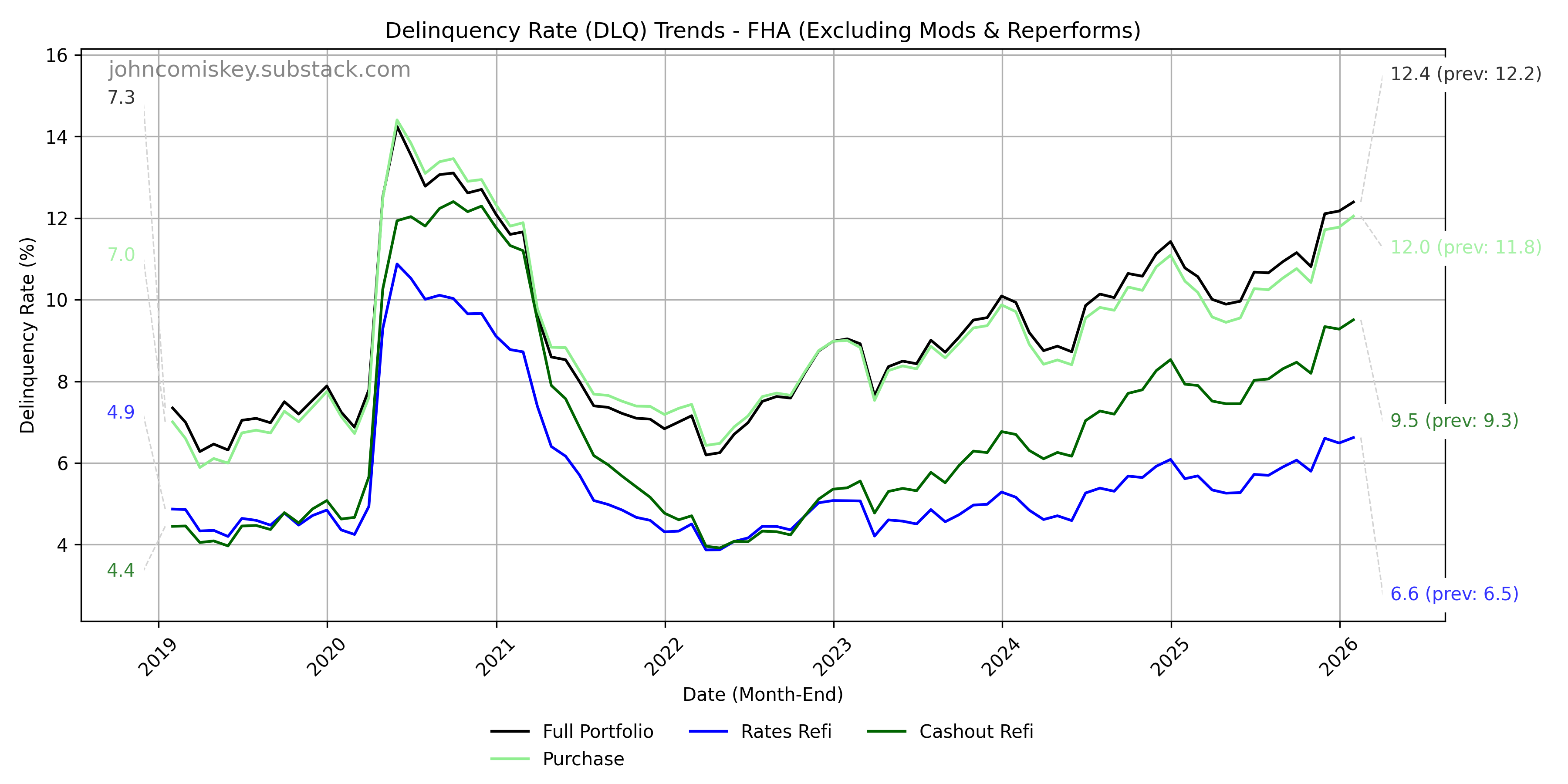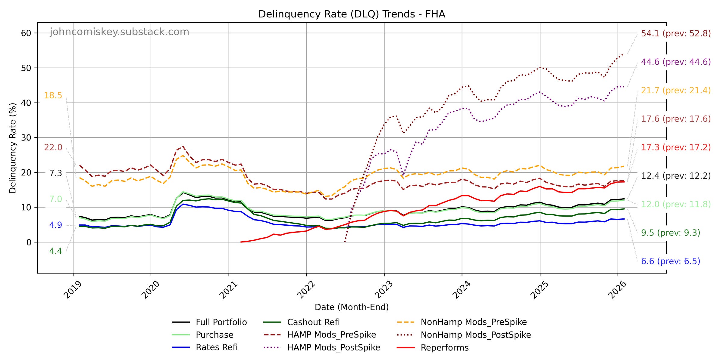 The MoM headline delinquency rates for FHAs in the GNMA II portfolio (about 7.1/8.1 million total FHAs) saw a significant increase in January rising from 12.17% in December to 12.39% in January.