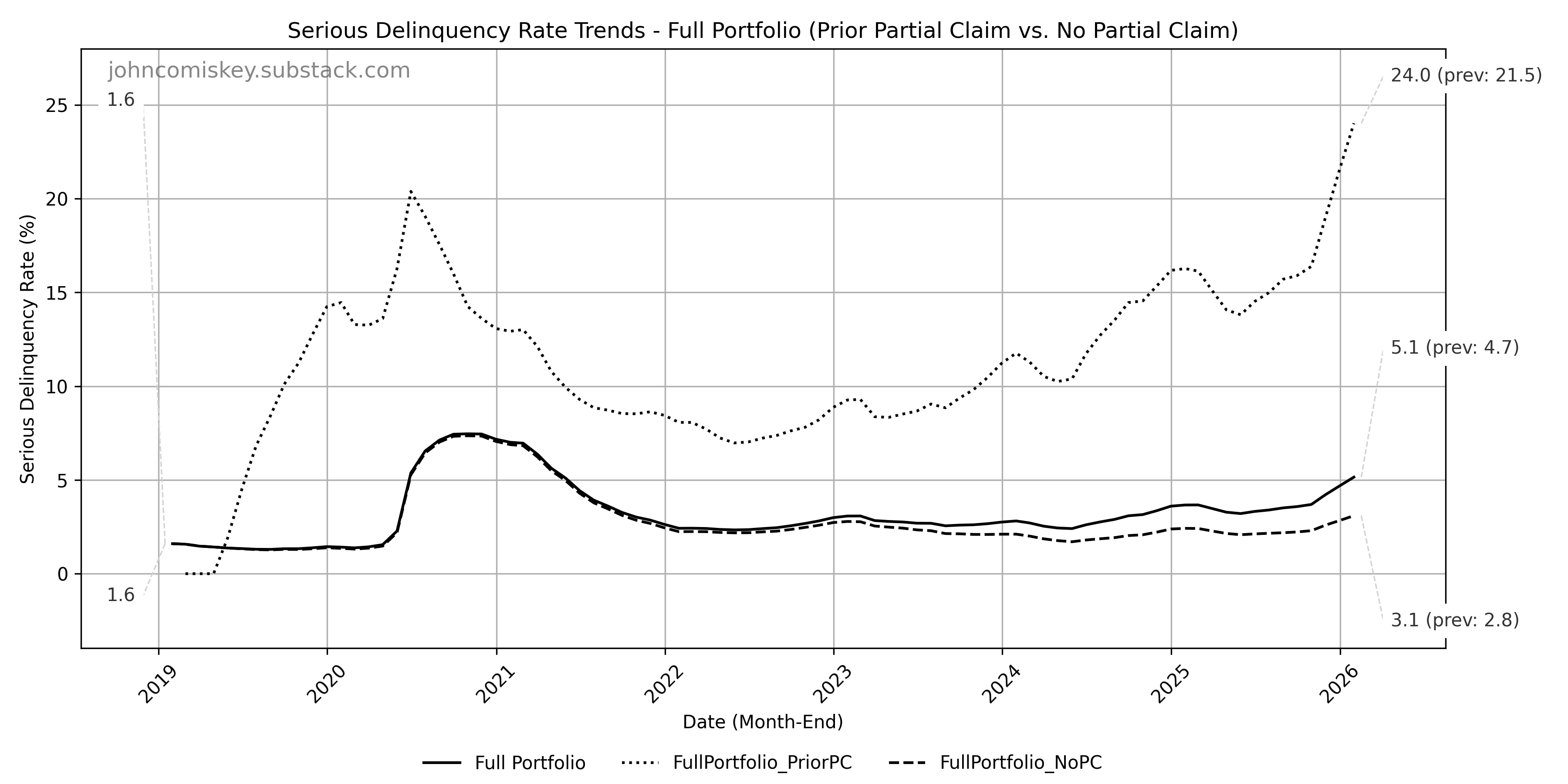 Broken record alert…… but once again your friendly monthly reminder. Whether a loan has had a partial claim or not in its history makes it 5-7 times more likely to be DLQ or SDLQ and over the last couple of months this disparity is further widening a bit.