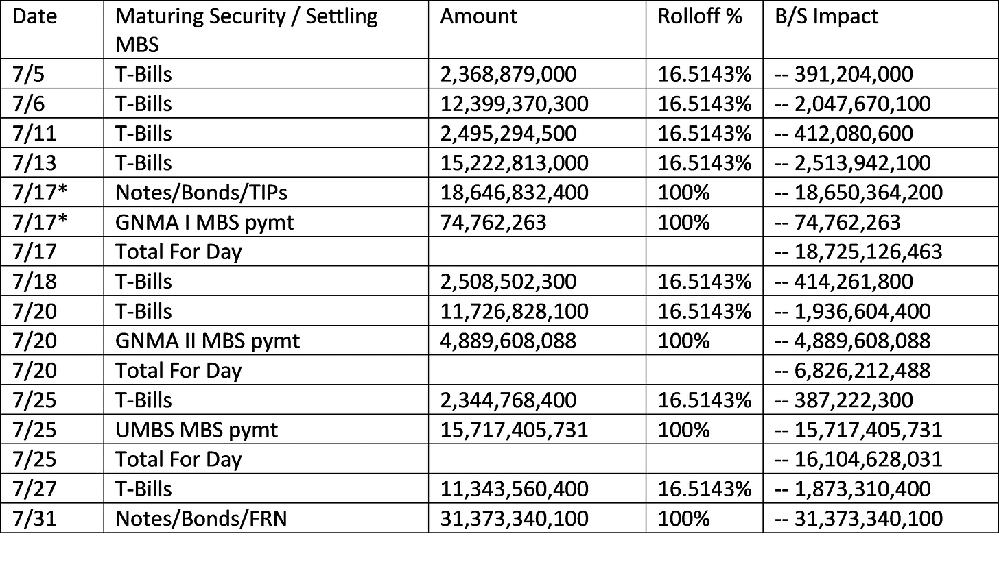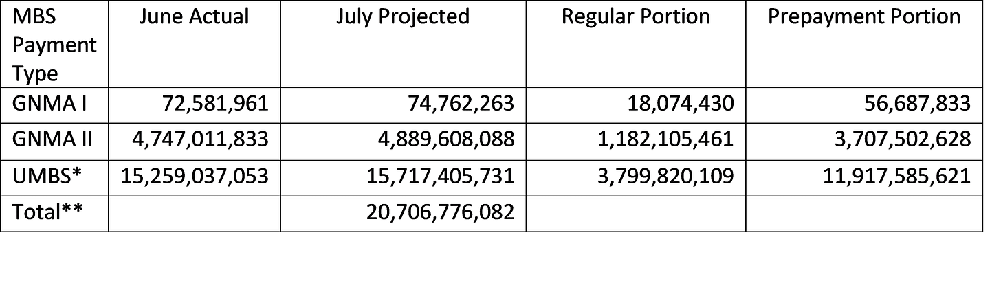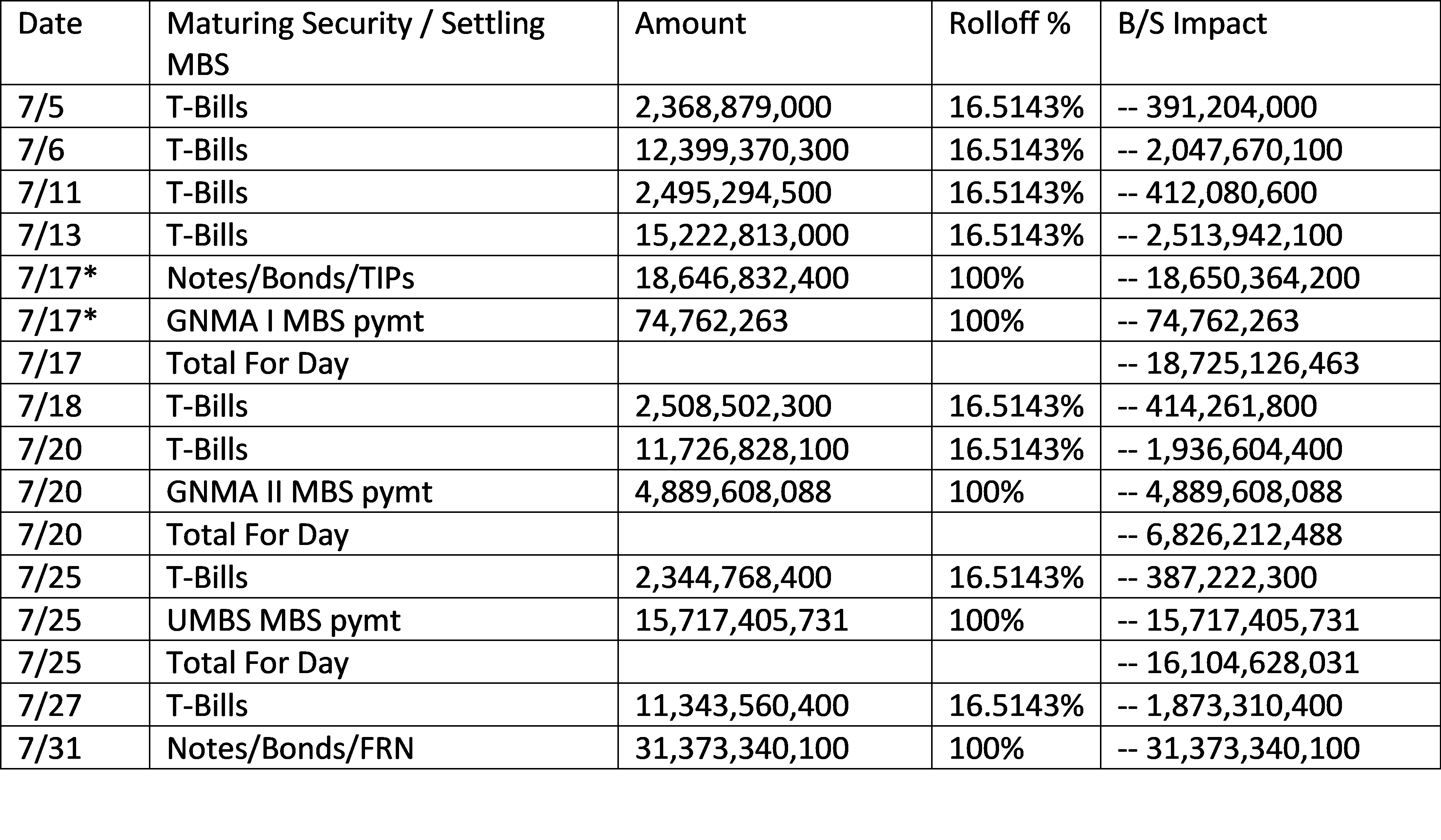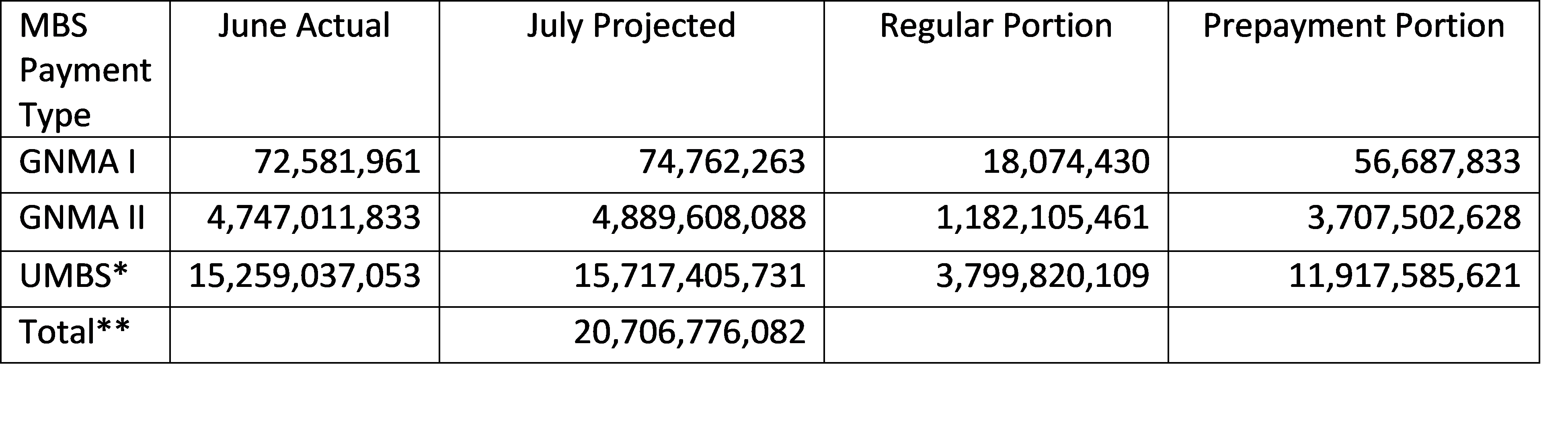 *The GNMA I MBS payment scheduled to be received on Saturday July 15th will instead be received the next business day which is Monday July 17th as will the July 15th coupon maturities.