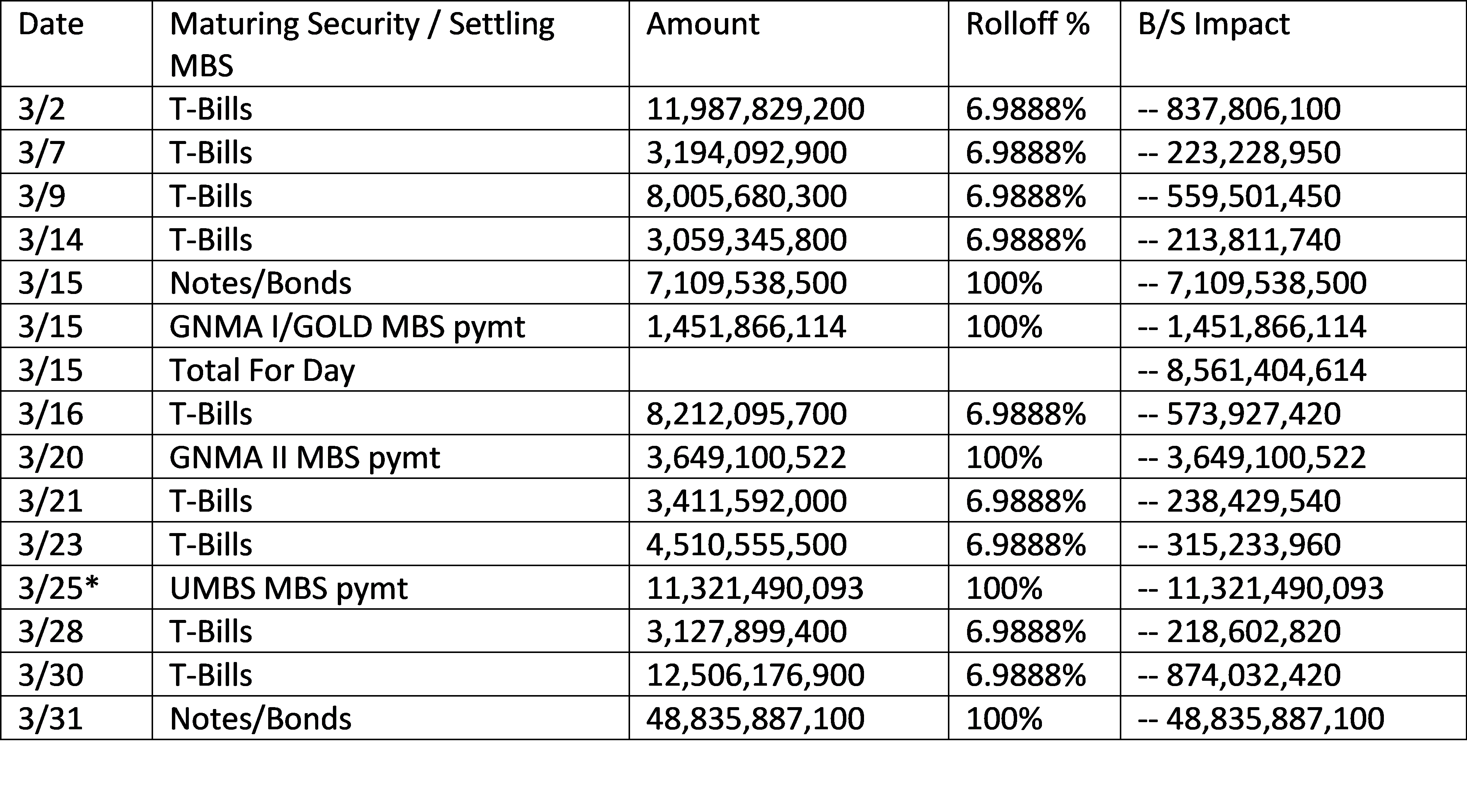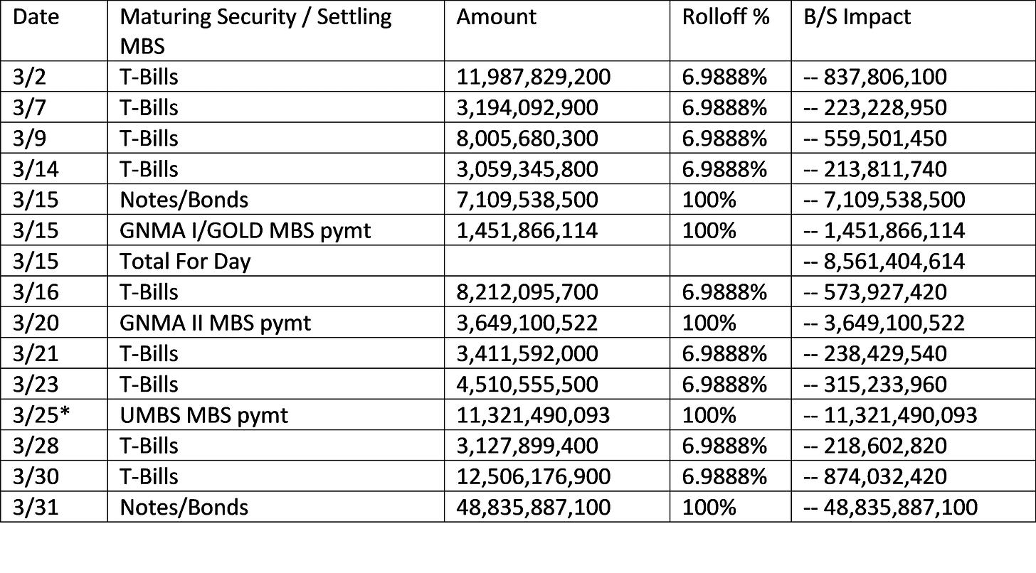 So coupons will narrowly miss the 60b cap meaning there will be 4,054,574,400 rolloff of bills as well. The Fed does this proportionally to the amount of bills maturing each week. For March, the rolloff percentage for bills is ~ 6.9888%. This is calculated by 4,054,574,400 (total bills to rolloff) / 58,015,267,700 (total bills maturing).