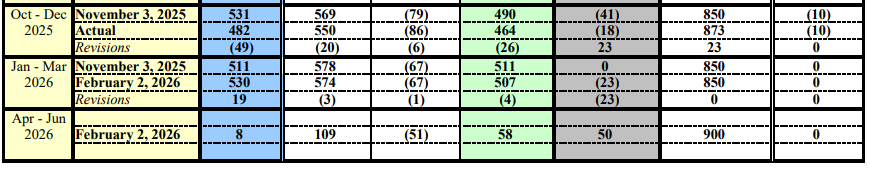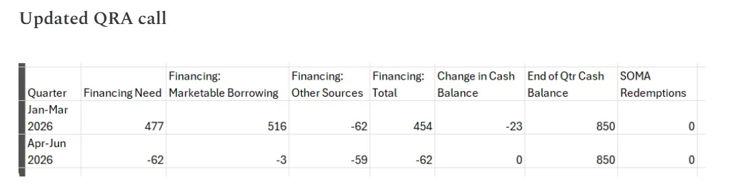 When I first started making these projections I graded myself on how close I got to Treasury’s projections. Not anymore. The actuals are are my measuring stick now. Note the 49b downward revision Treasury had to do for Oct-Dec 2025. The TTM was only 23b higher in my last projection before the Fall QRA. Thats my measuring stick now, for better or worse. The realized financing need for Q1 and Q2 will likely come in between my number and Treasury’s, but I bet both come in closer to mine.
