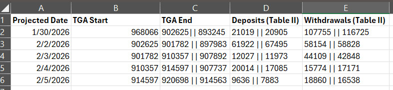 The TTM has done well through the first week of Feb. Judge for yourself. The number before the double pipe is the published projection for that day (from last weeks model output available in full to paid subscribers). The number after the double pipe is the actual figure for that day as published in the Daily Treasury Statement.