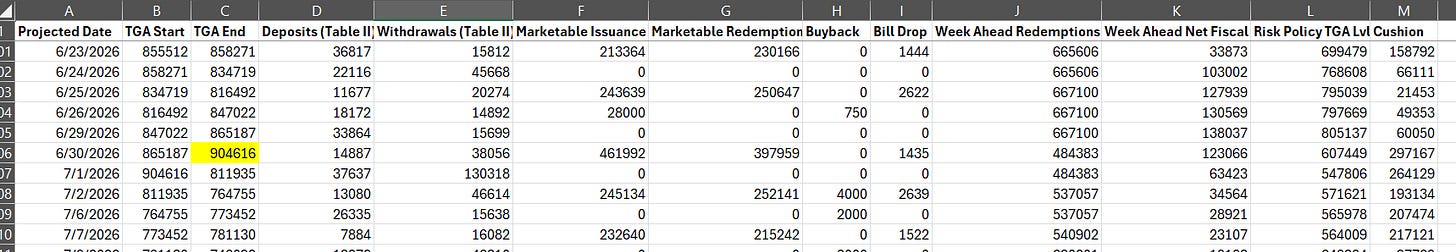 If reasonably accurate projections of the path of the TGA, months in advance projections on bill issuance changes and daily projections (again reasonably accurate) on every TGA spending and receipt category are of interest to you, please consider becoming a paid subscriber.